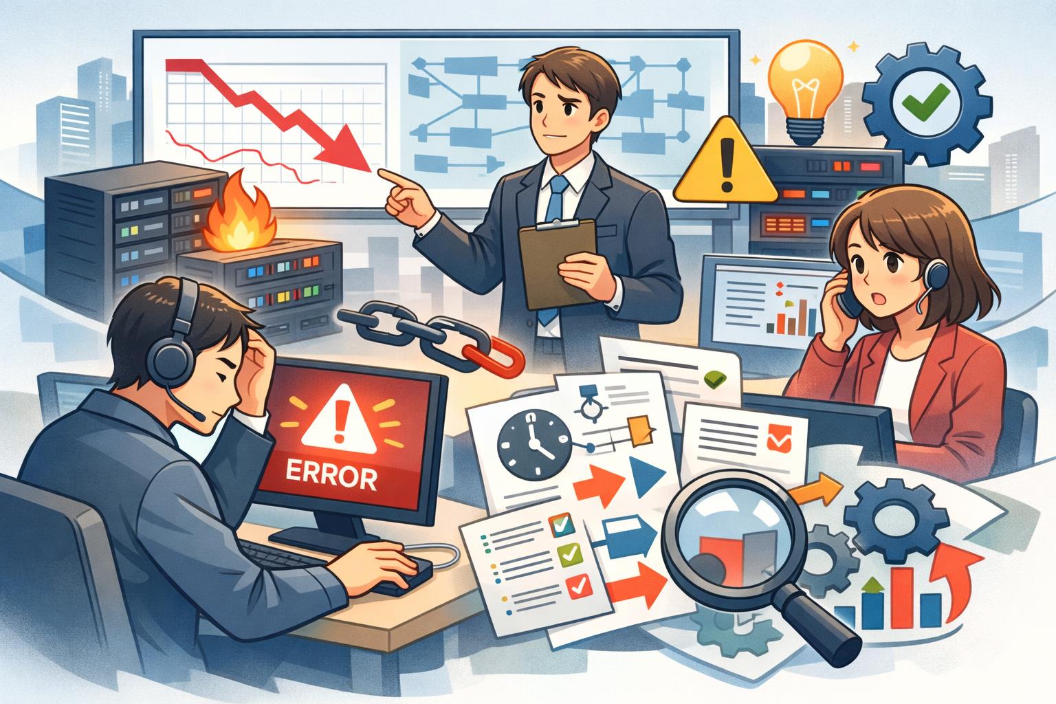 クラウドサービスやマイクロサービスアーキテクチャの普及により、現代のITシステムは非常に複雑化しています。多くのコンポーネントが連携して動作するため、障害発生時の原因特定はますます困難になっています。場当たり的な対応では解決が遅れるだけでなく、新たな問題を引き起こすリスクもあります。体系化されたプロセスに基づいてインシデントを管理することで、複雑なシステムにおいても迅速かつ的確な対応が可能になります。